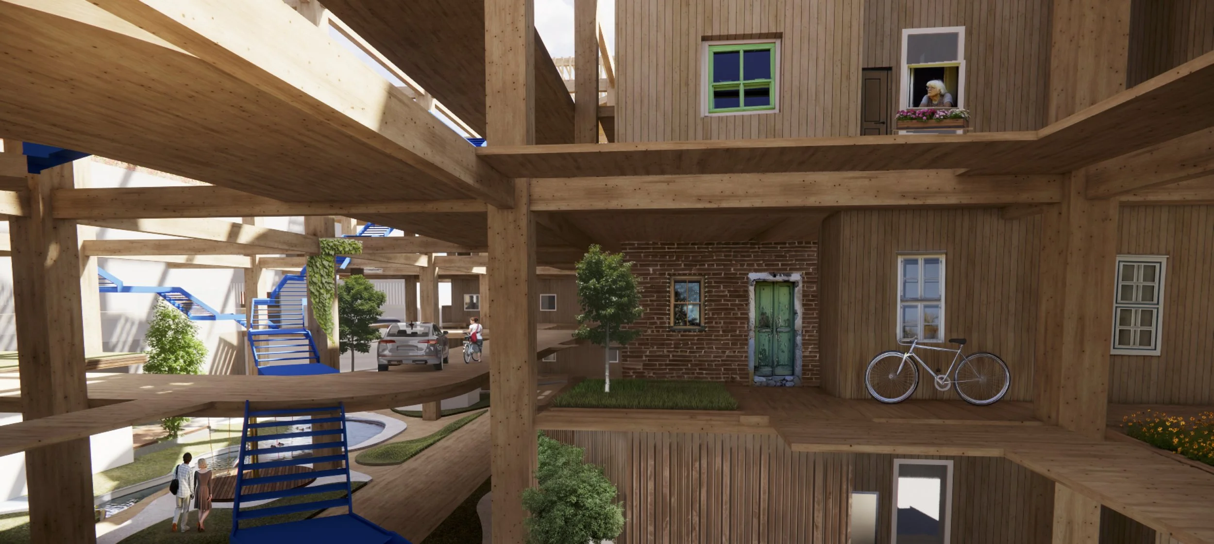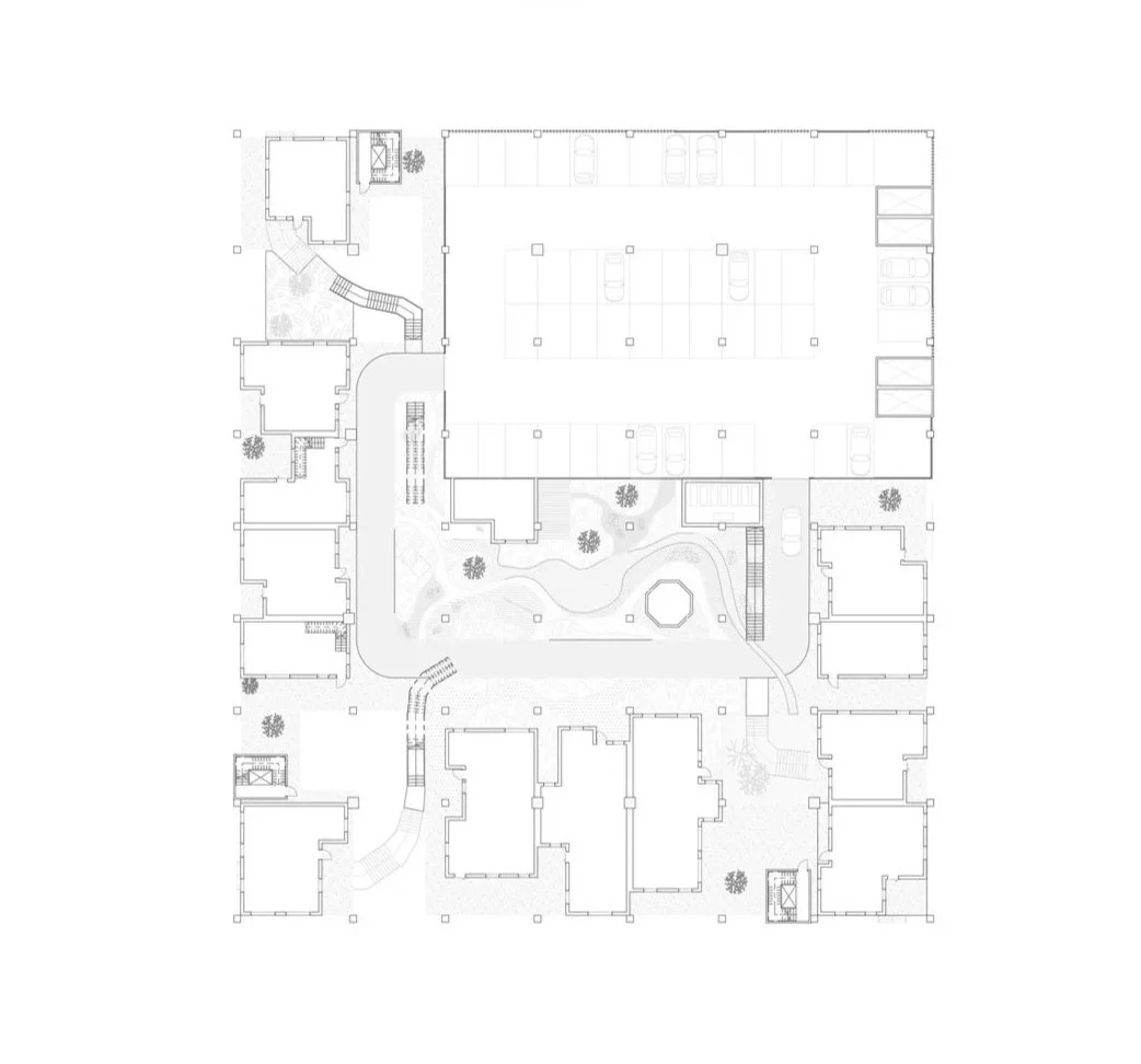 Prosjektet undersøker hvordan et mobilitetshus kan utvikles til en fleksibel og fremtidsrettet bydel. Utgangspunktet er et stort limtregrid som spenner over tomten og danner en robust struktur der funksjoner kan settes inn, tas ut og endres over tid. Gridet fungerer som et rammeverk for en vertikal by: et lagdelt nabolag med offentlige funksjoner, mobilitetstjenester, selvbyggerboliger og grønne rom.
